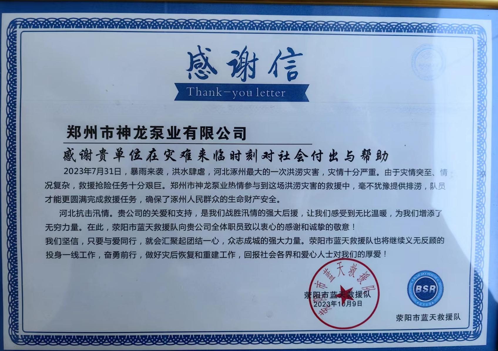 藍(lán)天救援隊感謝信